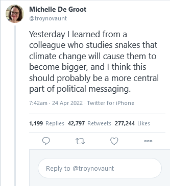 Given my ingrained fear of them, I snorted when I saw this tweet come down my Twitter line. In a world where many people pay lip-service only to the threats posed by climate change, I thought yes. Very much yes.