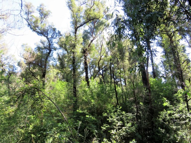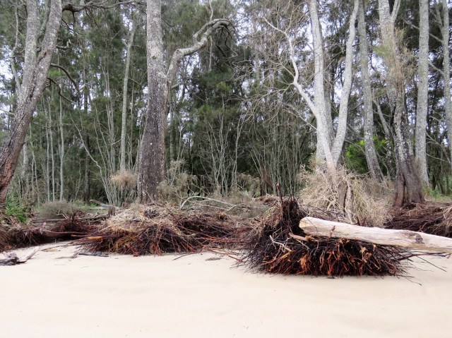 The beach was lined in what we call she-okes in this country. Excellent firewood, Mark says, despite being fast growing, brittle trees that can fall apart in our winds. She-okes are Casuarina equisetifolia, native to Australia and up through the Pacific into Asia. They are not a tree of great beauty in form or foliage, being typical of that somewhat scrawny, scruffy, rangy look of much of Australia’s tough native vegetation. What was interesting about these plants was the role they were playing in breaking the force of the sea and their ability to grow in areas where they must get inundated by salt water on a regular basis. That said, the front row of trees had fullly exposed roots and were falling backwards on a frequent basis.