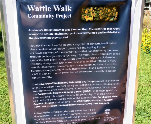 The more than 37 000 knitted wattles on the entrance lawn were both eyecatching (“Well, that is one way to get colour in the garden,” was Mark’s initial observation) but poignant in the extreme when we read the information board. Wattles, from the acacia family, are one of the first nurse plants to appear after fire. So these hand-crafted sticks of flowers were both an acknowledgement of the devastation experienced and a symbol of regeneration.