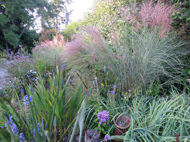 I have used the same miscanthus extensively in the Court Garden and they can stay there, even though the lot need to be lifted and divided this winter. That can be done when the flowering is past its peak. But it is another lesson we learned from several visits to Wisley that led to my decision to get them out of the borders next to the Court Garden. It seemed to us that Wisley had used Stipa gigantea in almost every garden there and, while a most obliging plant with the prettiest flowers of any grass I know (golden oats, is its common name), when it is used in many garden beds, it just ends up making them all look the same. Too much of a good thing. I have generally avoided repeating plants in the different summer gardens so that each one has a different look. Miscanthus ‘Morning Light’ was one of the very few plants I repeated and, with hindsight, that was not a good decision in our growing conditions as far as the twin borders go.