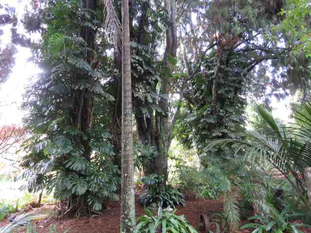 It wasn’t just the bromeliads. Zach and I removed huge amounts of Monstera deliciosa which had become monstrous indeed. We are fine with them climbing up; they add to the tropical look. Spreading outwards was another issue and removing most of the stems from the lower two metres opens up the views through which gives the feeling of more depth and distance in the garden. As he hauled out large amounts for mulching, many with aerial roots, Zach was musing how appalled plant sellers on Trade Me would be to see the wanton destruction of plant material they could sell at exorbitant prices!