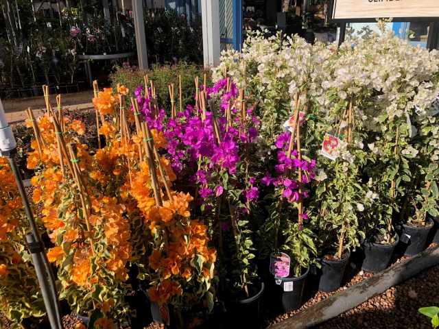 I like to photograph bougainvilleas around the world because, like jacarandas and poinsettias, they seem to be a universally popular plant in areas where they can be grown. I still think the cerise one we have and the red are the showiest and cleanest. I first saw a pale orange-yellow form in Greece – popular on the isle of Kalymnos from memory, but I can’t find photos of it in my files. I wasn’t sure I liked it much; it looked a bit insipid. We saw triple-grafted plants in a nursery in Bali – three colours on one root-stock and they were an interesting novelty for container growing. I had forgotten it came in white as well until I saw it in the Sydney garden centre last month and all I can think is that yes, it is possible to take a spectacularly showy plant and turn it into the most insipid option of all!
