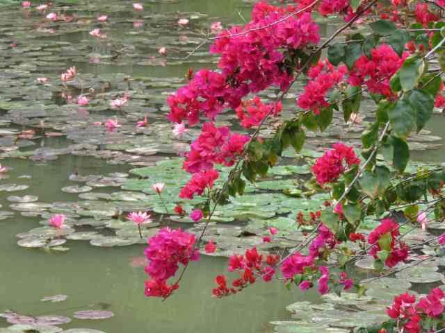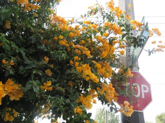 Oh my! I could not help but laugh. I thought I was the only one who was not impressed by them. Such rich color is so much better with a simple green backdrop. However, I have seen some that look quite appealing. Their wimpiness is one of their advantages. They really do not get too big, . . . although it seems to me that big bougainvilleas are the best. Well, anyway, I saw a few of these small variegated bougainvilleas seemingly crucified against trunks of Mexican fan palms near Los Angeles and looking . . . well, . . . colorful, without all the bulk. I would not want to do anything of the sort here. They really perform better with warmer weather. In this climate, they really do look much shabbier than other bougainvilleas. Yellow and orange bougainvilleas also do not look as pretty here as they do in Southern California. Their foliage is not so rich green, which is not a good backdrop for their bloom. Bougainvilleas with double bloom also look shabby here because they retain their deteriorating bloom.