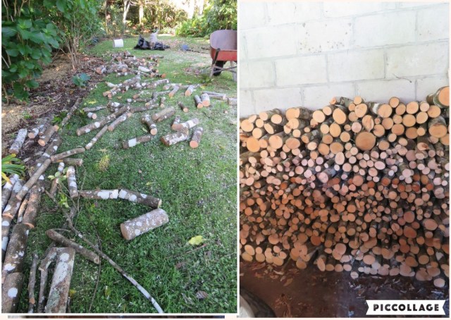 As is our usual practice, we deal with the waste by retrieving what is suitable for firewood and putting the leafy and twiggy remains through the chipper to use as mulch.