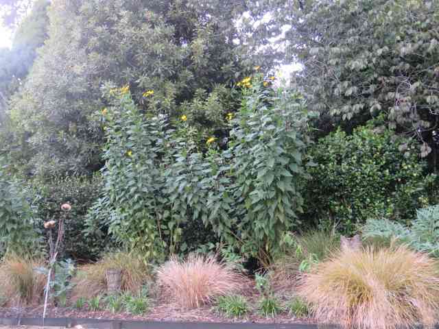 There is a bit of an open verdict on the Jerusalem artichokes as an ornamental plant. Put in last year, they have bolted to over 3 metres high. Canberra daughter looked at them and said she Chelsea chops hers but she is going to dig them out anyway and replace with the tall Echinacea laciniata. Not enough flowers, she said. I waited for mine to flower and she is right – foliage to flower ratio is waaaay too high. I saw yesterday that one plant has given up the ghost in moderately severe weather. I shall keep one patch to experiment with Chelsea chopping it next spring but it had better put on a better display of blooms or it will go the way of its compatriots which are destined to be removed this week.
