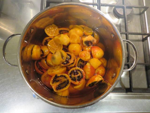 In my childhood, I think I was probably served them as dessert, stewed with a fairly large amount of added sugar. As a young adult, I encountered my mother-in-law’s winter salad standby of finely sliced onion, sliced raw tamarillo and a sprinkling of brown sugar. We have done away with the sugar now for salads. When we gather a surplus, I blanch them to remove the skins and then stew them before sieving them to remove the pips, adding gelatine and a small amount of sugar to turn them into a fresh fruit jelly. The usual way of eating them is to blanch them by pouring boiling water over to remove the skin and stem, slicing them and sprinkling them with sugar. I prefer them jellied to have with my breakfast muesli. They are very much a feature of our winter diet – both savoury and sweet.