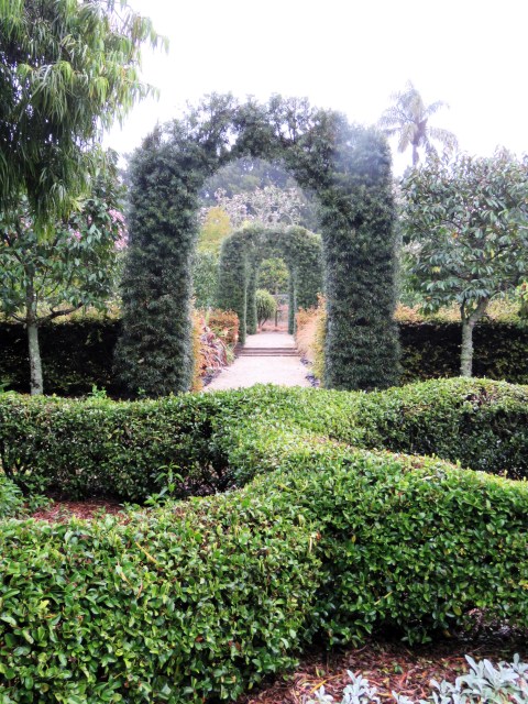 Credit to Zach, too, for creating the archways of Podocarpus parlatorei in the same garden. Mark had always planned either arches or gables – to echo the gables on the house. Realistically, had it been left to us, I am guessing we would probably have taken the easier route and just trimmed to tight columns but Zach has trained them over to be arches and they have almost filled out to final thickness. They are tied in, in case you are wondering how he did it. The key is getting it tied in when the new growth is soft enough to bend. When it has hardened, it will break. The podocarps are trimmed annually but he has kept the arch tied and trimmed every few months. Again, getting the ladder into place is the most onerous part of this task. Mark, Lloyd and I are all getting a bit old to be carting the largest ladders and working at height. This is just yet another reason why I appreciate younger generations.