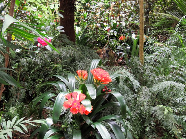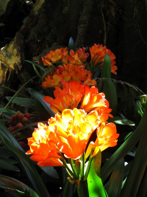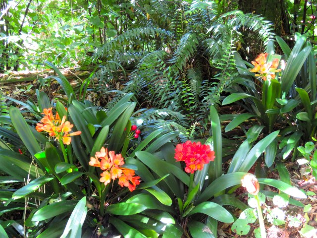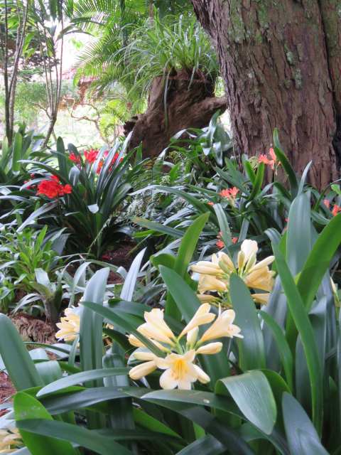 Time, too, has seen our clivia plantings go from strength to strength and they are certainly starring this spring. You can have too many clivias in a garden; the orange and red ones are very strident. I am not a fan of mass plantings of clivia but we have integrated them amongst other plants in shady areas and they glow. Ours are almost all seedlings raised here from controlled crosses. This means that Mark has taken the pollen from ones he thinks are good and used the pollen on other selected specimens, marked the pollinated flowers and gathered the ripened seed to sow in nursery conditions. It is quite a bit of faffing about but increases the likelihood of getting superior seedlings rather than leaving it all to Nature. We now have so many that we just weed out seedlings and thinnings.