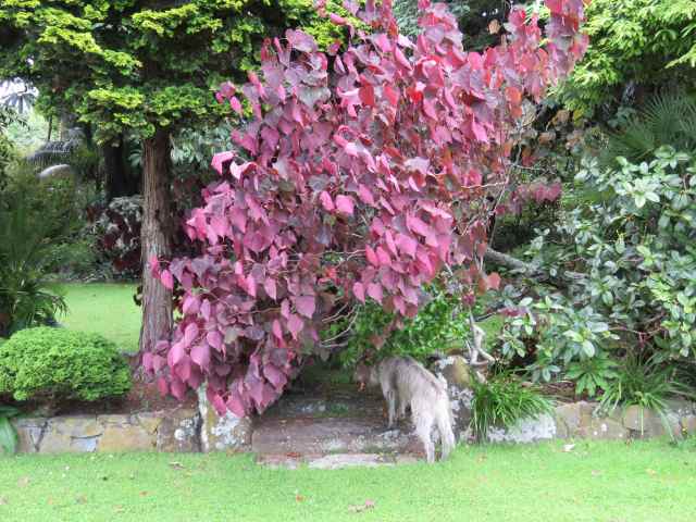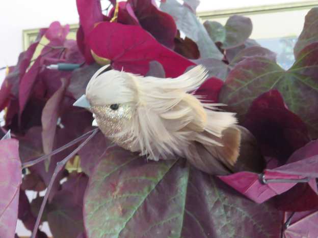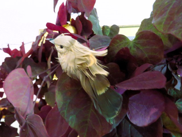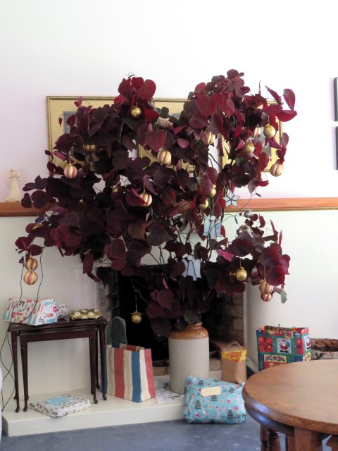Then the Cercis ‘Forest Pansy’ fell over. It seems to have root problems and it hadn’t even been windy when we noticed it down. It seemed more manageable than the Montezuma Pine although Mark doubted its capacity to take up enough water to keep it alive when cut off. So far, so good. It only has to last another three days so I think it will make it. It is nicely colour-toned to our pink sitting room; it cost nothing either in dollar terms or in environmental impact. It is just not your traditional Christmas tree. I had to bypass all the small decorations because of the big foliage so the decorative aspects are… restrained, shall I say? Golden balls, feather birds and my glass decorations I made back in the days when I was a moderately competent leadlighter and copper foiler and the remaining Christmas lights.