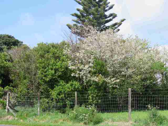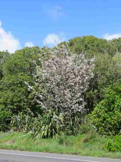 I have never noticed before just how many white flowering cherries there are all around the countryside but once I started looking, they were e v e r y w h e r e. There has been a lot of talk in this country about the evils of the-early flowering, carmine-red Prunus campanulata so favoured by our native tui. Some areas have gone so far as to completely ban it – around Nelson and in Northland, I understand. They are somewhat controversial to grow and most will seed around too freely. But I can’t find the same level of concern concerns expressed about white prunus spreading itself far and wide in this area. There is a whole lot more of it around this neighbourhood, clearly self-seeded, than P. campanulata. I am no expert on cherries but looking up the pest plant lists, I figured it is quite possibly Prunus serrulata. There is a list of 13 different prunus species on the national plant pest accord, all identified as problematic and banned from commercial production and sale. P. serrulata seems the best match to what I see in bloom right now.