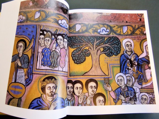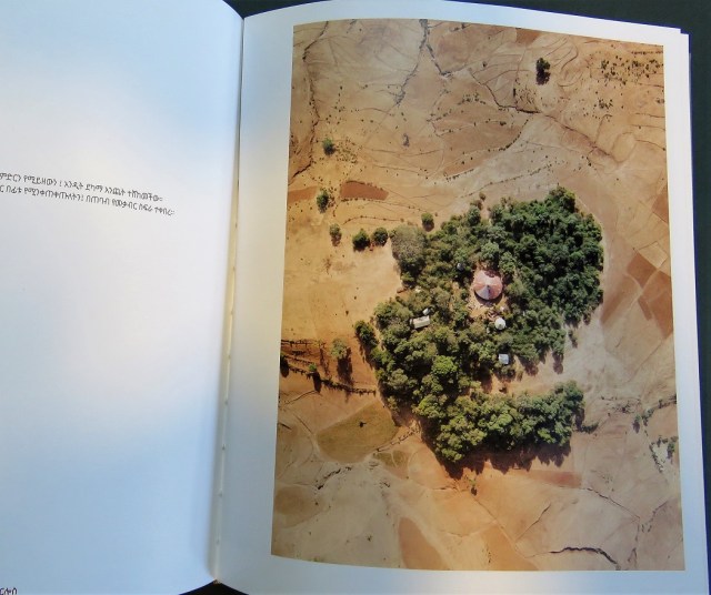 It is predominantly a book of photographs of the local people and the environment in Amhara Province with a lot of aerial shots showing the agricultural deserts where the only remaining native forests are patches of green surrounding churches. The Tewahedo Orthodox Christian churches are a distinctive round shape like domes or saucers and the reason why the small patches of remnant forest around them survive is because they are sacred. Think miniature gardens of Eden in a desert. It is a unique landscape.