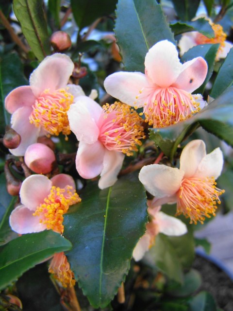 Our form of sinensis is pink flowered which is unusual. But I think I strategically placed additional flowers to make this photo showier than it is in real life.
