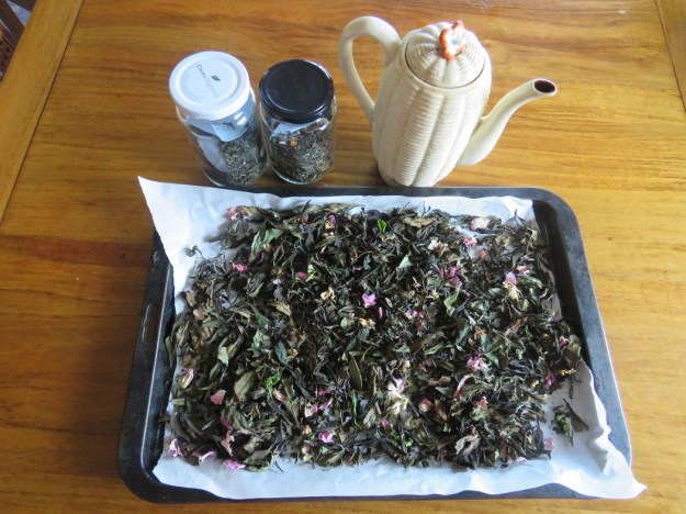 My home-grown tea is free. Because we like aromatic teas, I have flavoured three batches differently. The first is lemon scented – I added some of the young leaves of the lemon myrtle – Backhousia citriodora. The second batch I dried with orange blossom (proper orange, not the mock orange philadelphus) and a few fine peelings of the outer rind of an orange and rose petals. The third was lime (lime blossoms and few young leaves) with mint and rose petals.