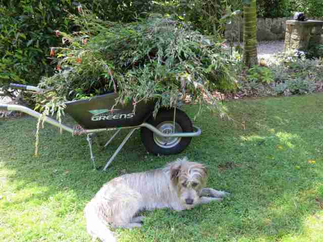 It used to take me ages to prune a plant like this but I am getting faster with practice and this was an hour from start to finish, using secateurs and a pruning saw. The pile in the wheelbarrow is well over half the plant in volume. Ralph supervised, as he does, but did not offer advice.