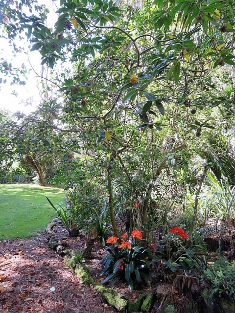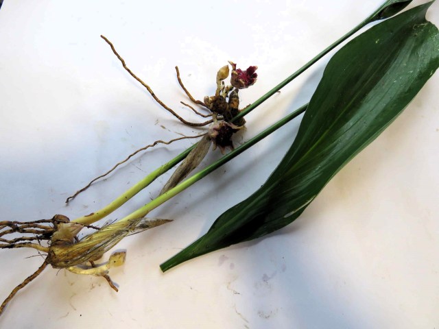 I had looked at this large clump of ours without ever really pondering what it was. I was more disappointed in the fact that I had never seen it flower. I imagined a plant with foliage like that putting up a white spadix-type of bloom, not unlike a peace lily. No, Zach, told me. The flower comes from the base and you have to ferret around the base to find it. No wonder I never saw it flower. The clump has always been one of those anonymous plants that is just there to furnish a space.