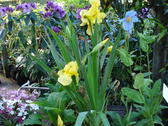 The flowers of Festival in our retail area this morning, October 28. From front left, rhododhypoxis (3 colours, $6 a pot), primula inshriach hybrids, yellow bearded iris and Mark’e meconopsis hybrids ($10 each) and at the back, Rhododendron Bumblebee (big plants, $25)