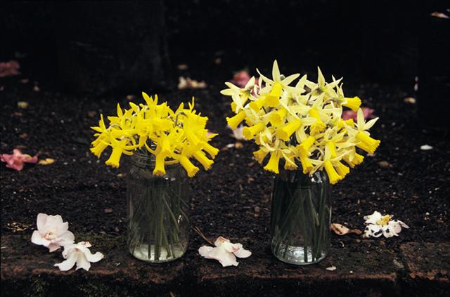 Narcissis Twilight (Felix Jury). Dwarf cyclamineus hybrid with slight reflex perienth, yellow trumpets with lemon petals. Particularly good performer.
