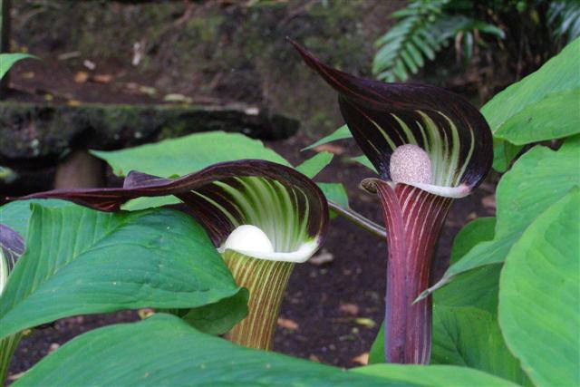 In recent years, Mark has been playing with arisaemas to get hybrids which will perform well as garden plants with their hooded flowers held above the foliage as well as with an extended colour range. Without much of a winter chill, we struggle with some of the choice species here and have to work to keep A. sikkokianum happy in the garden. However, Mark’s hybrids have proven to be a fantastic feature from spring to summer. We have so many of them used as woodland bedding plants that some garden visitors are inclined to think that they should be able to buy a punnet of six plants for about $2. We have never sold any of these arisaema hybrids and have no plans to in the immediate future so at this stage they are unique to our garden.