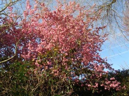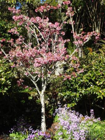Prunus campanulata Petite Pink – a campanulata hybrid and a true dwarf reaching around 2.5 metres only (as compared to others which quickly grow to double or even treble that height). Small clusters of carmine pink bell flowers. Compact habit.