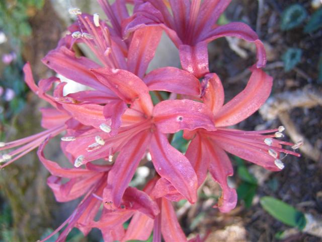 The autumn flowering nerines are a rewarding feature in our garden here and both Mark and Felix have dabbled in extending the colour range and form, particularly in the sarniensis hybrids. Felix liked the subtle, smoky colours whereas Mark is looking for reliability as garden plants and something new in colour or form. To date, only three have been named and sold though there of selections of considerable merit in the garden here. Nerine Coral Star (Mark Jury). Large bulbs produce tall flower stems with large blooms in soft coral salmon tones with white stripes and markings.