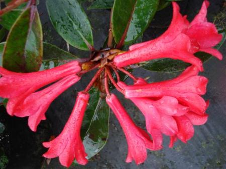 - Jaffa (Halo x javanicum) Mark Jury hybrid. Luscious, large, glossy green leaves and large trumpets in full truss of up to 15, in bright red to orange. Tropical look, even when not flowering. Bushy, lower growing.