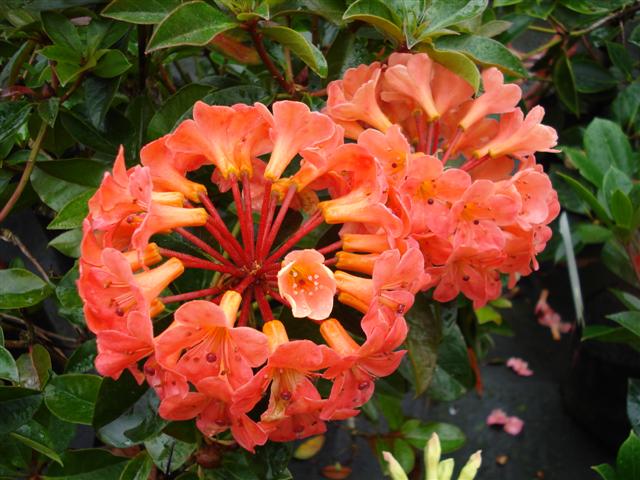 - Golden Charm (macgregoriae x Princess Alexandra) Felix Jury hybrid. Trusses of many smaller flowers in apricot to orange. Red stems and dark glossy foliage are outstanding. Vigorous but compact. Tends to mass flower, unlike most vireyas.