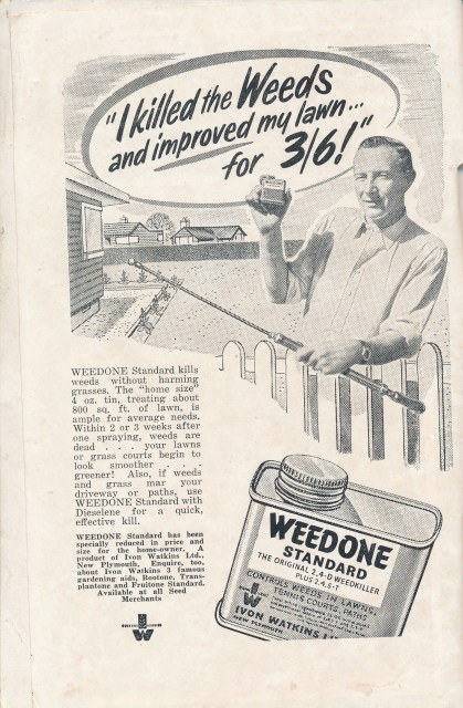 There are an uncomfortably large number of advertisments like this one where you, too, can nuke your lawn with a mix of 2 4 D and 2 4 5 T – often known as Agent Orange which was used to lay waste to the forests of Vietnam. Such a bargain at 35c!