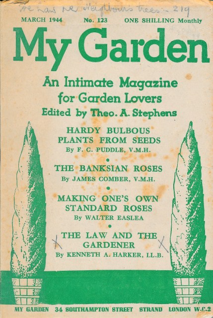 We appear to have a few more issues of the English ‘My Garden’ edited by Theo A. Stephens. The fact that the August 1950 one proudly proclaims it is the 200th issue suggests it started publication in late 1933 or maybe January 1934 but our earliest copies are from 1943. It is subtitled ‘An Intimate Magazine for Garden Lovers’. I did wonder if it was a forerunner to the Royal Horticultural Society journal named ‘The Garden’ but I don’t think so. My quick browse of Theo Stephens’ publication on line simply showed me that there is a thriving international market for early copies but I am not looking to sell our ours. Looking at an issue from March 1943 – written in the midst of WW2 – was oddly haunting with parallels to the current state of our world in a global pandemic.