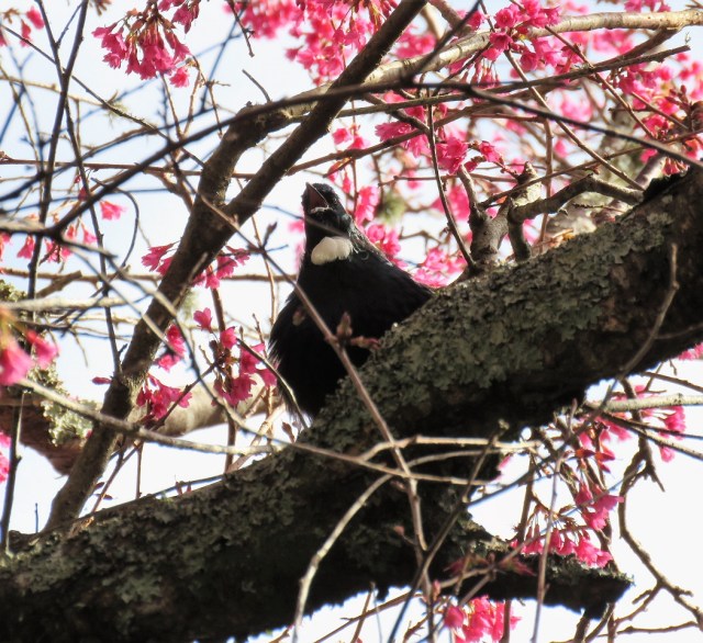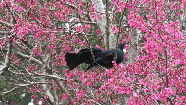 Totally unrelated but prettier – the tui are holding their annual convention in our Taiwanese cherry trees (Prunus campanulata)