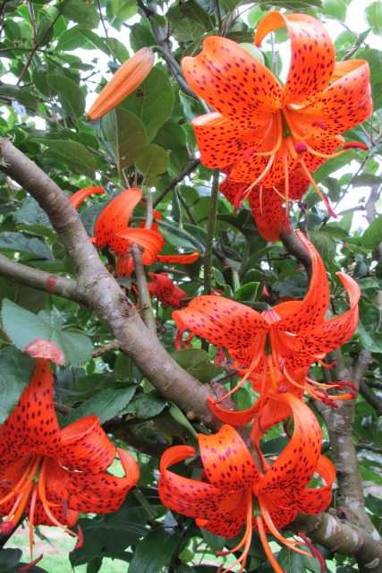 I disentangled the heritage of the Aurelians some years ago and it seems that they are all hybrids starting with Lilium henryi from China, originally crossed with another Chinese species L. sargentiae. We don’t have L. henryi here any longer. Mark says he was once given a good form of it but he lost it. It is sometimes referred to as the tiger lily (probably because of its dark spots) but the tiger lily is more commonly used as shorthand for Lilium lancifolium syn. L. tigrinum which we do have. They are similar in flower form with reflexed petals but different shades of orange. L. sargentiae brought in the trumpet shape and the scent and the ever-handy internet shows me that it is a similar type of lily to what we often refer to as the Christmas lily (on account of it flowering at Christmas in the antipodes) or the regal lily – Lilium regale. Since then, the genetics have become ever more mixed as other species have been used in breeding but the ancestors of our golden and apricot delights lie back in the mists of time with those two species, henryi and sargentiae.