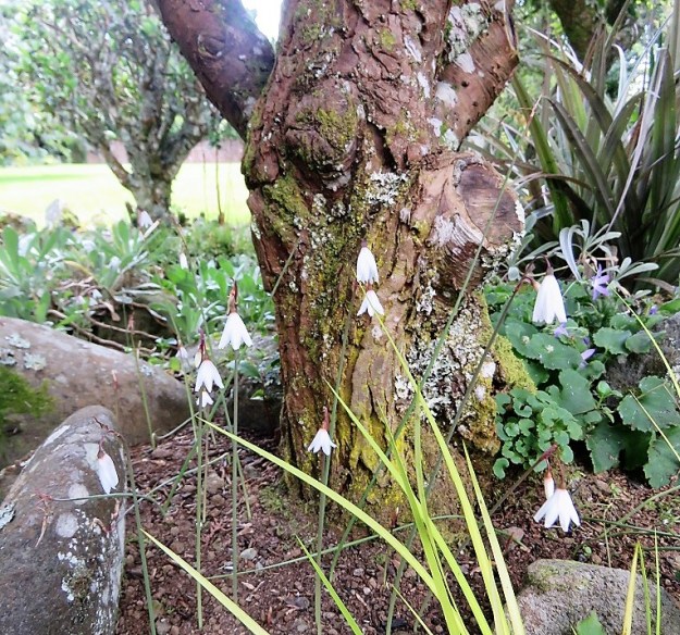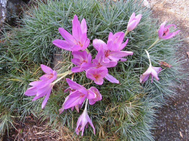 The rockery has two peaks, in early to mid spring and again in autumn. We are just entering the autumn phase when the nerines (the first ones out are the red blobs in the upper right), cyclamen, colchicums and many other autumn bulbs bloom.