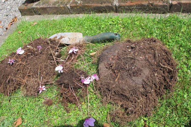 Cyclamen hederifolium tubers with trowel to give scale