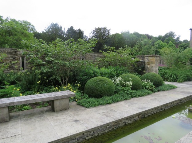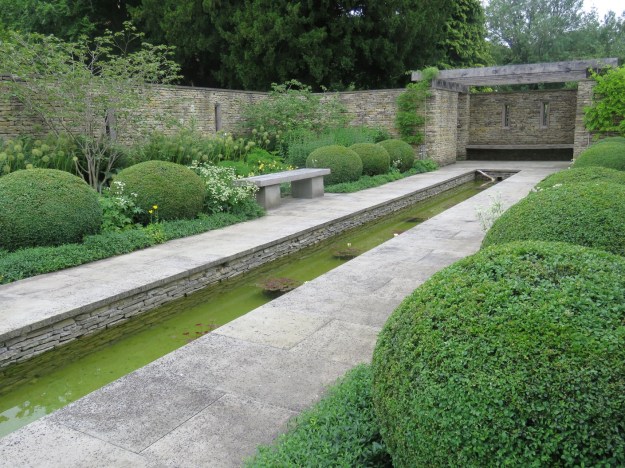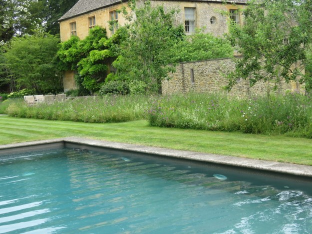 To set the scene, from memory the owners told us it is an acre in size. It is flat and Pearson took it back almost to a blank canvas. With the typical Cotswold two-storeyed cottage in the local golden stone being on the road side of the site, the body of the garden has four distinct sections, three of which feature water. The first is by a charming stream boundary and centres on a large elliptical pool with restrained plantings. The second is a formal garden built around a canal, with a dining area closest to the house. The third is the most spacious and contains a swimming pool. It was apparently the first garden Pearson had done that included a swimming pool and he was not keen. I can understand why. Pools are awfully difficult to integrate without turning it into the Miami look. But this pool was beautifully executed, though that is easier when you don’t have our laws requiring childproof fencing close in on all swimming pools.