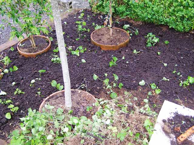 Enter the rabbits. After a quiet few months on the rabbit front, they are back and there is nothing they like more than an area of soft, freshly dug garden and mulch to dig. I sent Zach a text yesterday telling him that the rabbits were undoing his work. He was equally unimpressed but at least the photo shows you the size of division he split off from the previous carpet to replant.