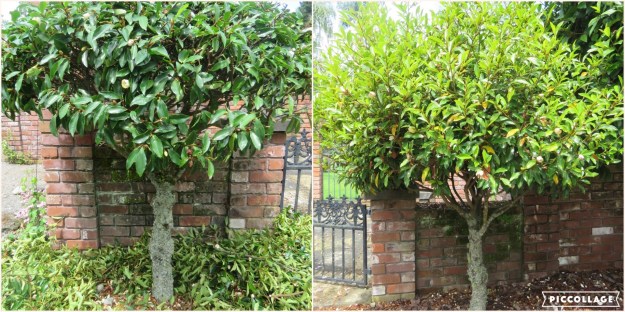 We clip for future blooms so we only clip once a year, as they finish flowering. By the end of summer, they can be a bit woolly in appearance but if we cut again then, we would be removing many of the flower buds. If you want a sharp form all year round, don’t start with plants you want to flower well, at least not michelias or camellias. We use secateurs to trim. Hedgeclippers may be faster but they cut all the external leaves, the edges of which then go an unsightly brown. There is only a day’s work in clipping this row and cleaning up.
