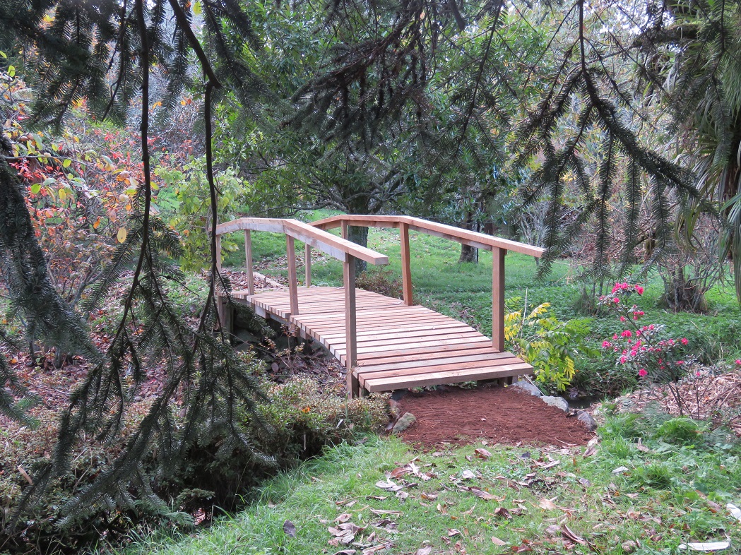 In the days when we were a bit more ambitious about opening to the public, we put two bridges in the park which were conceived as features. What we call the high bridge or the wisteria bridge is constructed on an old truck chassis that had been galvanised to protect it from rust. It is not visible, but that is what is holding the bridge timbers securely. Both it and the stone bridge were constructed by a hyperactive and obliging German engineer who was spending some time in New Zealand.