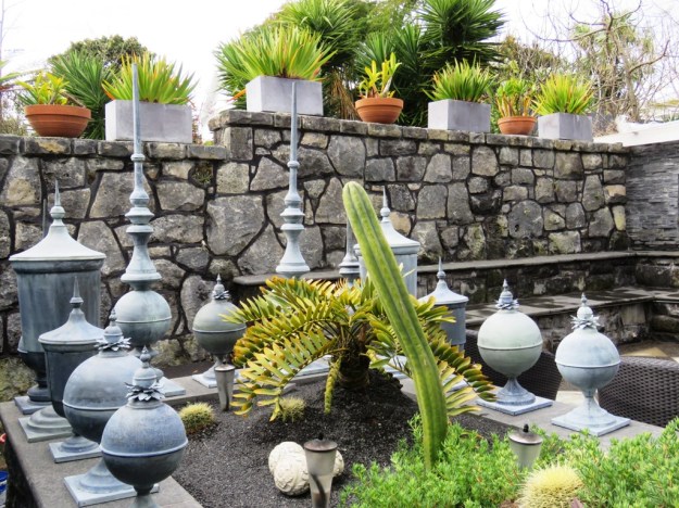 When it comes to lidded urns that bear a slight resemblance to a certain style of funeral urn, the same principle may apply. If you are going to have one, it may well look considerably more dramatic if you have many, as in this interesting and contemporary small Auckland garden.