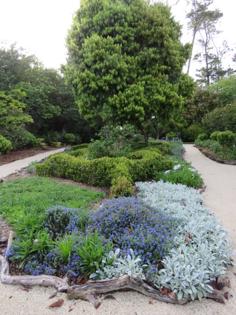 The Wave Garden drew inspiration from Tom Stuart-Smith in the definition achieved by undulating hedges giving form (we used little Camellia microphylla) with tall plants in the central enclosures and lower plants in the outside bays. It is the only colour-themed and block-planted garden we have, limited to blue and white.