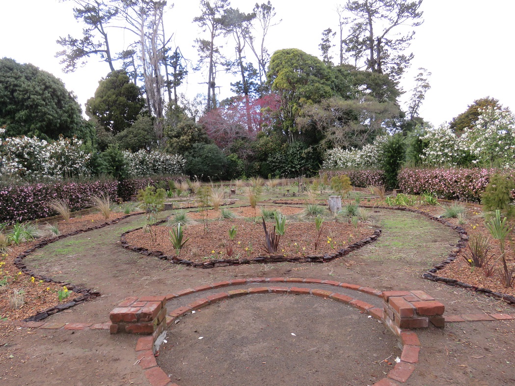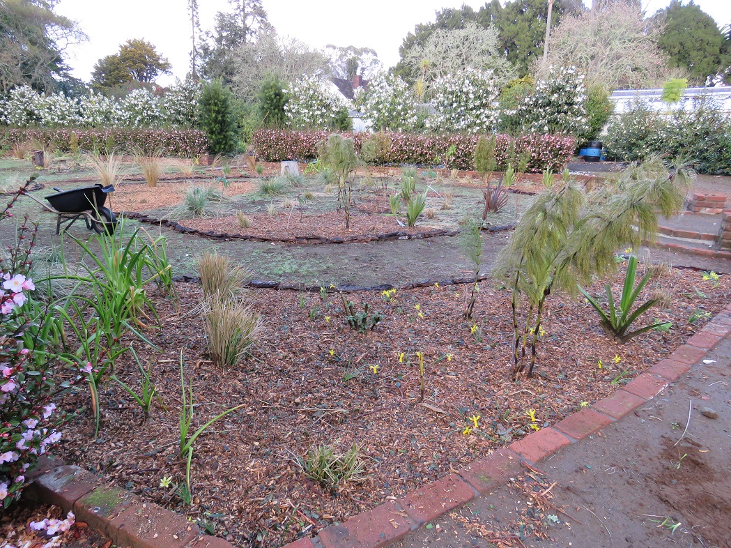 Our compromise was to go for that seamless look and meandering paths in the area we now loosely refer to as ‘the grassland’. It is a transitional filler space, primarily using just two native brown grasses, Carex buchananii and Carex coman’s ‘Bronze’ along with a fair swag of interlopers (‘volunteers’ as we call plants that just arrive of their own accord), residual survivors from its earlier uses and bulbs I have added for seasonal interest. So, a limited plant palette overall and most of the maintenance is pulling out seedlings (particularly of the carex) and a bit of occasional grooming of the grasses. It is not carpeted in cream grit but in woodchip – paths and mulch. It is a lower-key look that lacks the contrast and lightness given by the cream grit but it is a long-term, sustainable option in our conditions.