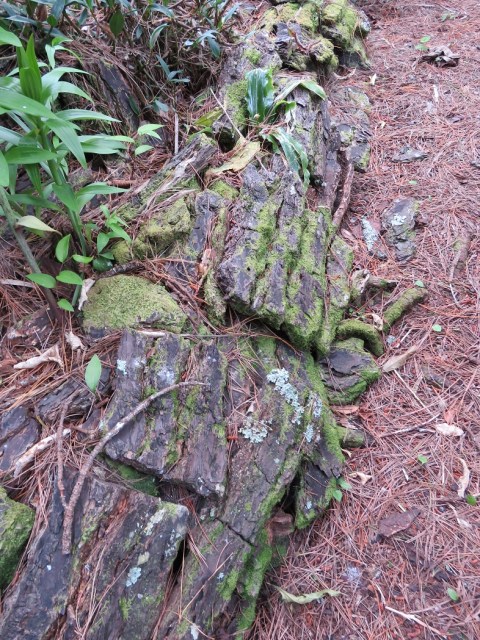 One path is still blocked unless you are of small stature and willing to crouch to pass beneath the trunk. It is likely that it will be left like that. Mark and I will continue to use the path but others will take the easier route. You can see the epiphytes still clinging on to the fallen trunk.
