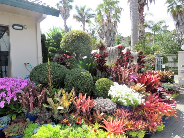 I failed entirely to find the work area for this garden although I think I read on their information sheet that it is screened from view out the back somewhere. I wish I had spotted it because I would have liked to have seen what the scale and set-up was. The very bright light conditions and crowds of people mitigated against getting photos that do justice to this garden which is a pity because it was a truly remarkable example of a garden of obsession. Whether I like it or not (and it was not my style at all) is gloriously irrelevant. I was in awe at the scale and the attention to detail. It was absolutely immaculate down to every last plant – the vast majority of which are in pots. Anything that looks a little marked or ‘off’ is clearly whipped out the back and replaced with a healthy substitute. It is all hand-watered, by owners who understand the differing water needs of each and every plant. It is also vibrantly colourful.