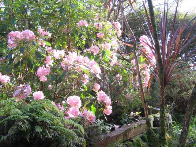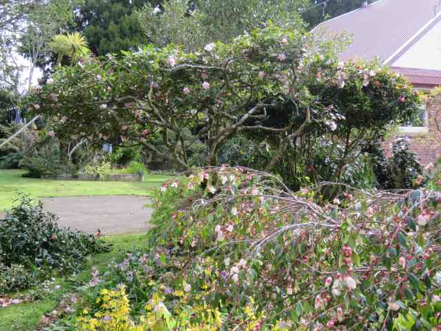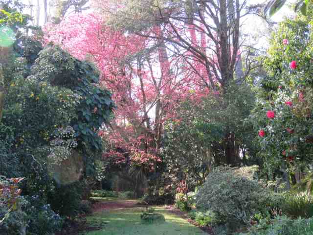 The bright pink Prunus campanulata are controversial in this country because of their seeding ways but this enormous specimen is sterile and doesn’t set seed. The greatest danger is being hit by low flying birds as scores of tui move around the garden.