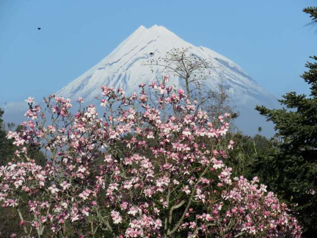 Magnolia campbellii var campbellii in our park. The snow line on Mount Taranaki is high this year, indicating a milder winter than some other years.