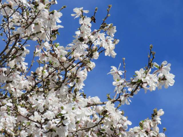 Blue skies a-plenty. With a white magnolia – likely kobus, flowering in a garden down the road.