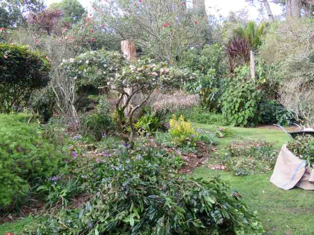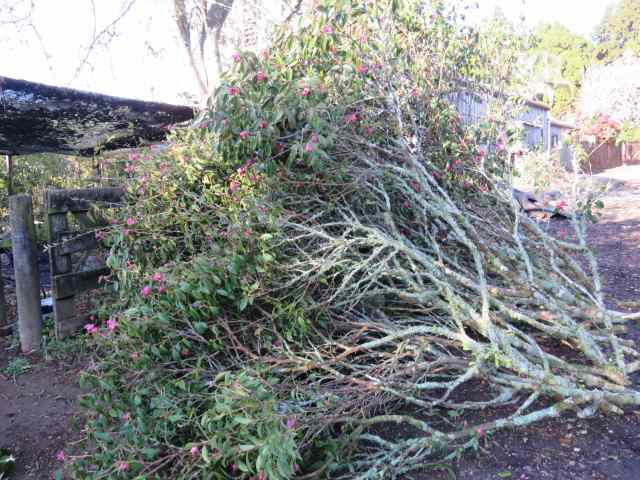 Camellia ‘Fairy Wand’ started life as a miniature back in the days when miniature only applied to the flower size and not, as most people assumed, growth habit. Bred by Os Blumhardt in Whangarei, Mark planted it, ‘Gay Baby’ and ‘Tiny Star’, also from the same breeder, beside our driveway. After about 40 years, they were all about six metres tall and in a decidedly leggy state, with wayward branches being cut off to keep the driveway clear. We stagger our extreme pruning here. ‘Tiny Star’ was cut back two years and is now a bushy little column shape about two metres tall. This week was ‘Fairy Wand’s’ turn for drastic treatment. ‘Gay Baby’ will be done at some stage in the next two years, when ‘Fairy Wand’ has rejuvenated. We don’t want a row of three massacred plants. It took Zach all of an hour to cut back the Fairy and about the same length of time for Lloyd to mulch it up for wood chip.