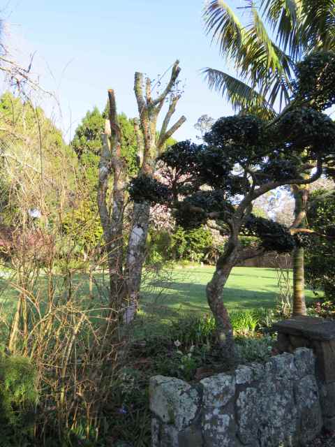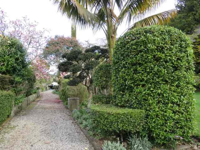 Taking Fairy Wand down behind gives this tableau of clipped camellias a whole lot more impact, especially the cloud-pruned sasanqua Elfin Rose. We are now thinking of dropping Fairy Wand behind even lower so it stays below the cloud pruning.