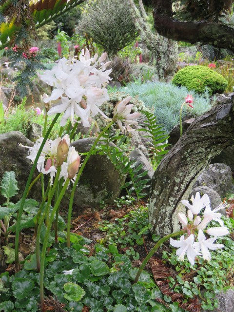 Cyclamen hederafolium is one of the star performers for us, opening its first flowers as early as January and continuing through late summer to peak in autumn. Once the flowering is finished, the lovely heart shaped dark green leaves which are lightly marbled in silver remain a feature through winter. Flowers vary in colour from pure white, pale pink to dark pink, though not on the same tuber. As long as the tuber does not rot out, it can get very large over time – at least as big as a bread and butter plate. It is best nestled into the soil, as opposed to buried beneath. In C. hederafolium, the roots, flower stems and leaves all sprout afresh each year from the top of the tuber so you need to plant it the right way up. It will grow in full sun through semi shade to woodland conditions of high shade and, when happy, it will seed down over time and naturalise – as long as you don’t garden around it with weed spray. Good drainage is the key.