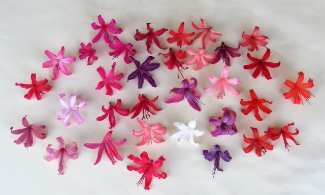 Despite their common name of the “Guernsey lily”, nerines hail from South Africa. While there are over 30 different species, the ones most widely available include N. fothergillii (scarlet flowers often referred to as the ‘spider lily’), N. bowdenii (late season flowering, sugar pink with long stems) and N. sarniensis hybrids. It is the hybrids that bring the larger flowers in desirable colours which can range from smoky hues, purple, salmon apricot and across the whole spectrum of shades associated with pink and red. There are white cultivars though I would have to say that we have never found a good pure white form which performs well. All make excellent cut flowers and have a long record of use in floristry.
