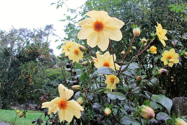The first cymdidium orchid is opening. This somewhat understated one is always the first of the season and is a top performer in its spot, arching over the old stone millwheel which has been repurposed a bird bath.