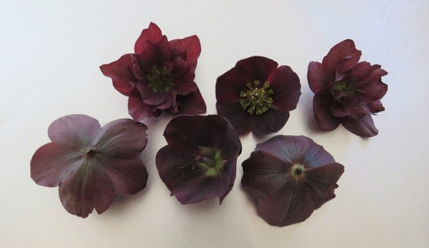 Sunday was wet and gloomy so I picked hellebores to photograph indoors. And what a wonderful subject for photography they are. All I did was collect one representative bloom from a number of plants. This was more illustrative in intention than artistic endeavour.